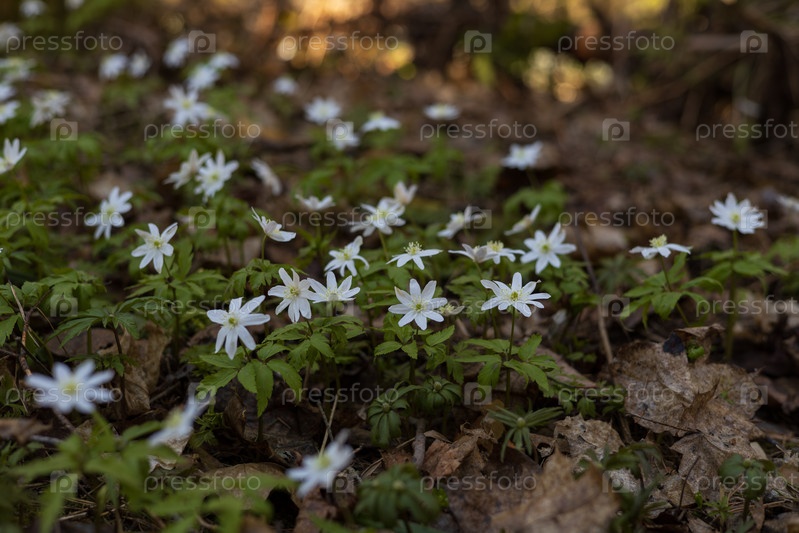 Ветреница дубравная цветущая в лесу солнечный весенний день, первоцвет подснежник
