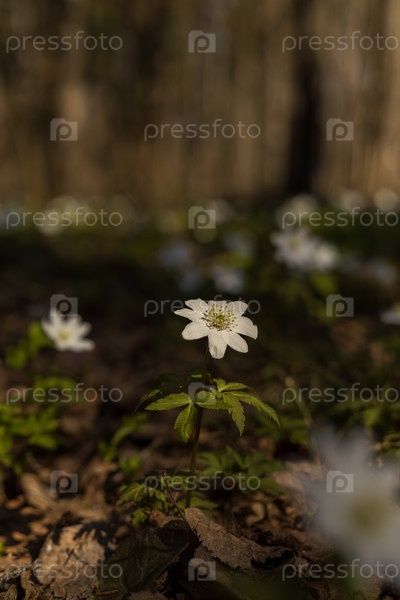 Ветреница дубравная цветущая в лесу солнечный весенний день, первоцвет подснежник