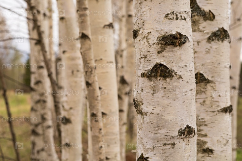 Березовая роща, белые стволы берез крупный план, ранняя весна