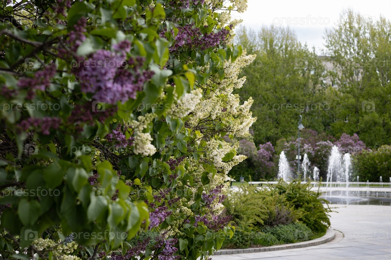 Куст цветущей сирени в городском парке в облачный пасмурный весенний день