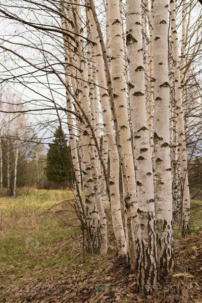 Березовая роща, белые стволы берез крупный план, ранняя весна