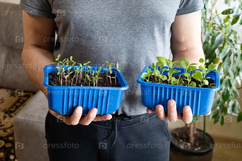 Рассада цветов в горшке в руках мужчины, домашнее выращивание урожая