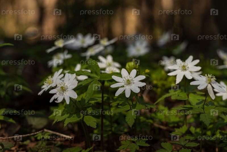 Ветреница дубравная цветущая в лесу солнечный весенний день, первоцвет подснежник