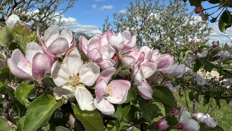 Яблони цветущие розовыми цветами в саду, солнечный весенний день