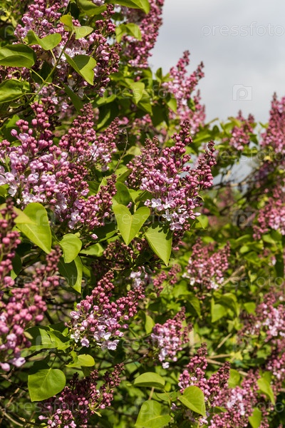 Куст цветущей сирени в городском парке в облачный пасмурный весенний день