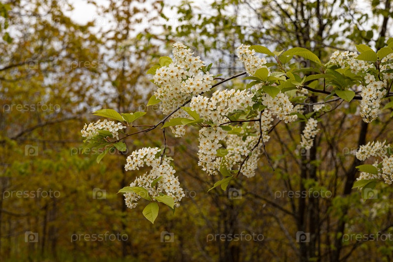 Черемуха цветущая белыми цветами на фоне весеннего леса