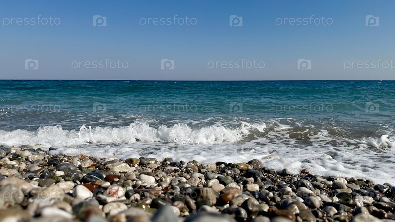 Волна разбивающаяся о прибрежные камни в солнечный день на море, Турция