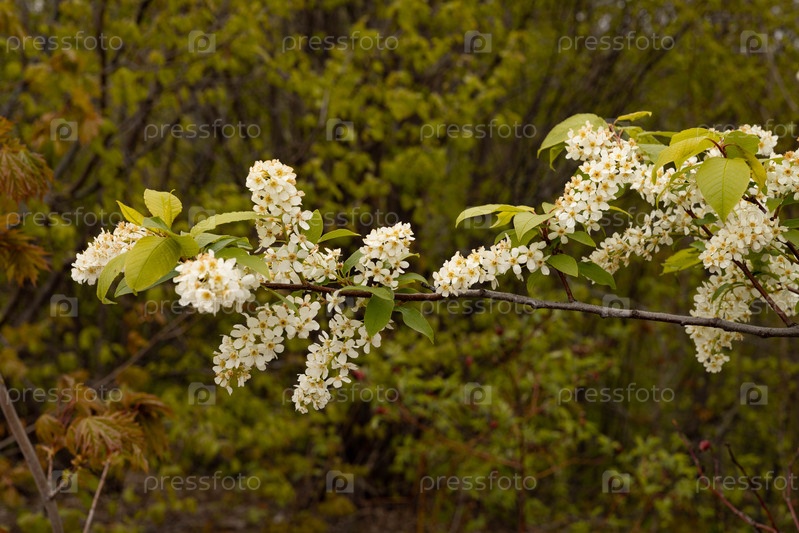 Черемуха цветущая белыми цветами на фоне весеннего леса