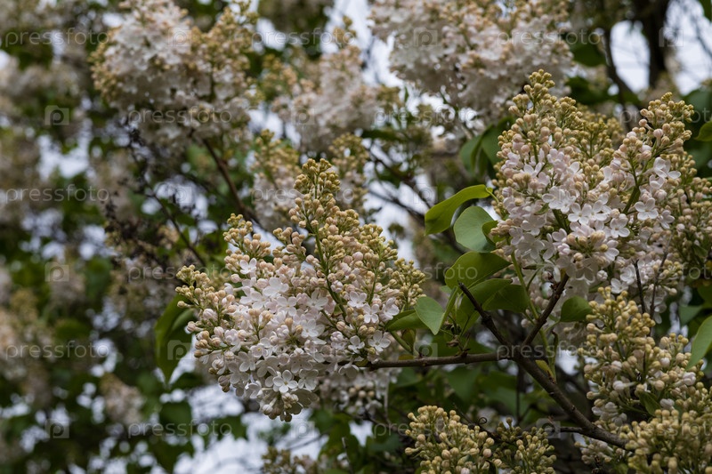 Куст цветущей сирени в городском парке в облачный пасмурный весенний день