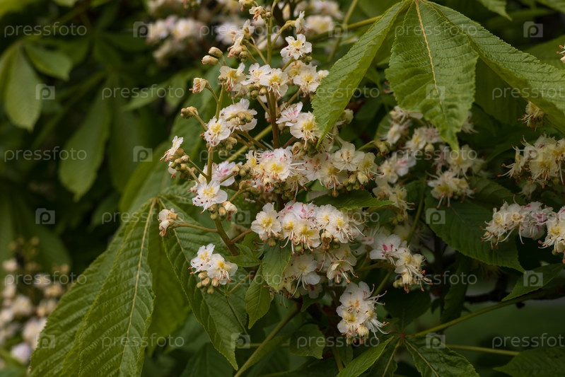 Каштан цветущий в городском парке весной, крупный план