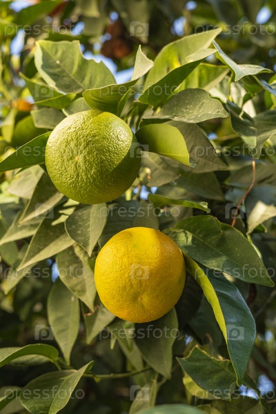 Желтый и зеленые плоды лимона на ветвях с зелеными листьями, Турция