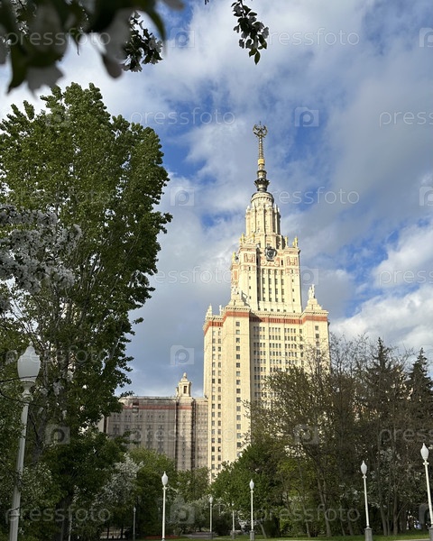 Здание МГУ в окружении цветущих деревьев в солнечный весенний день