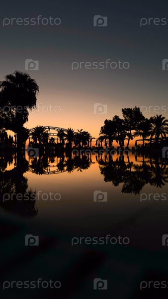 Рассвет, восход солнца, солнечные лучи подсвечивают территорию отеля в Турции, лежаки у бассейна