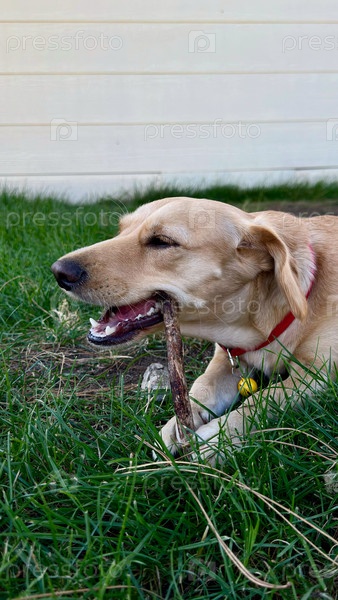 Маленькая гладкошерстная собачка играет с палкой на траве, светлая шерсть, красный ошейник, летний день