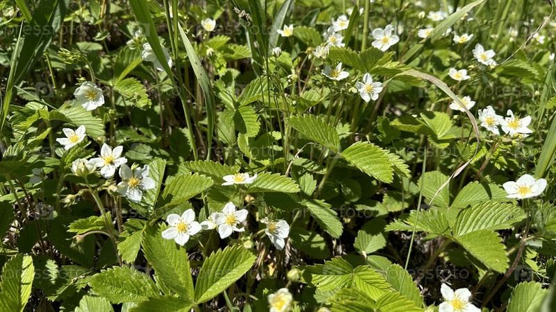 Цветущая летом на лугу клубника дикая луговая полевая лесная