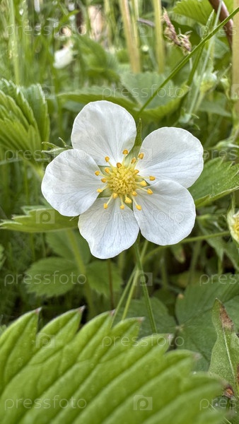 Цветущая летом на лугу клубника дикая луговая полевая лесная, крупный план