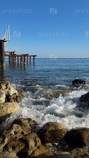 Волна разбивающаяся о прибрежные камни в солнечный день на море, Турция