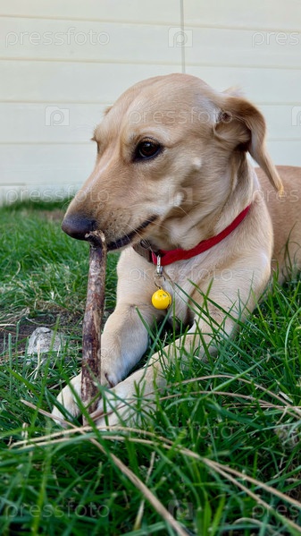 Маленькая гладкошерстная собачка играет с палкой на траве, светлая шерсть, красный ошейник, летний день