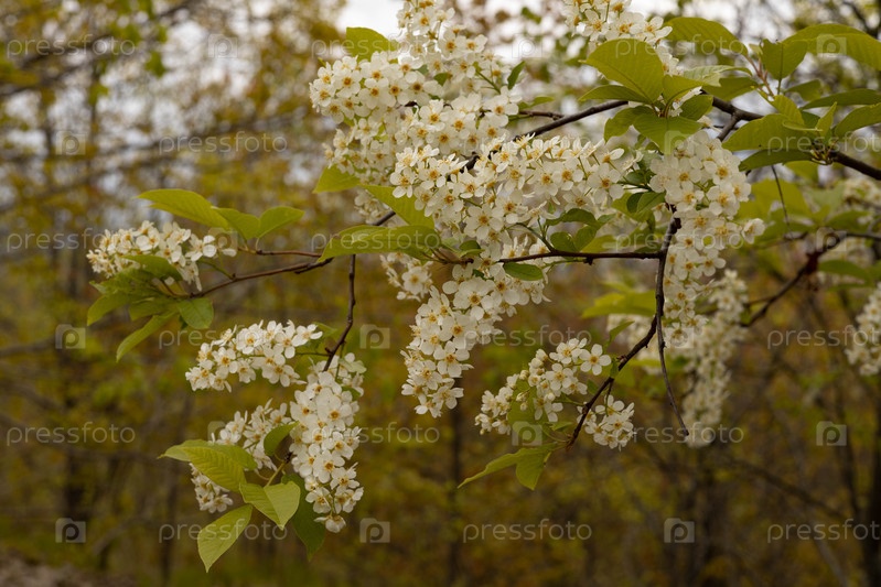 Черемуха цветущая белыми цветами на фоне весеннего леса