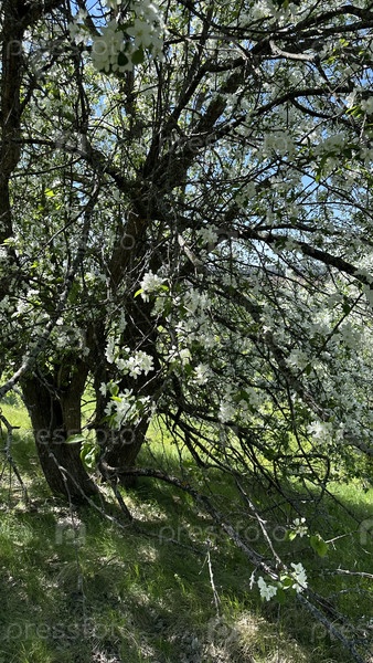 Яблоня цветущая в саду весной, солнечный день