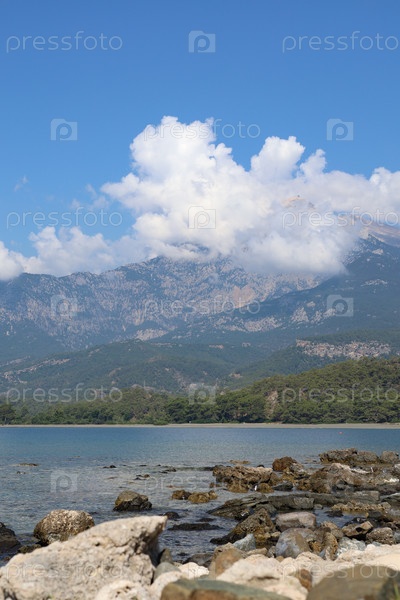 Облака над горами, Средиземное море, каменистый берег, Турция