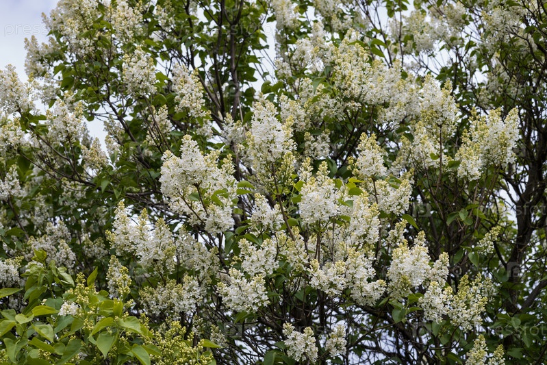 Куст цветущей сирени в городском парке в облачный пасмурный весенний день