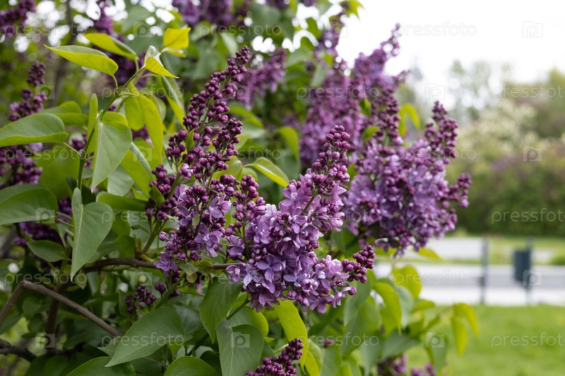 Куст цветущей сирени в городском парке в облачный пасмурный весенний день