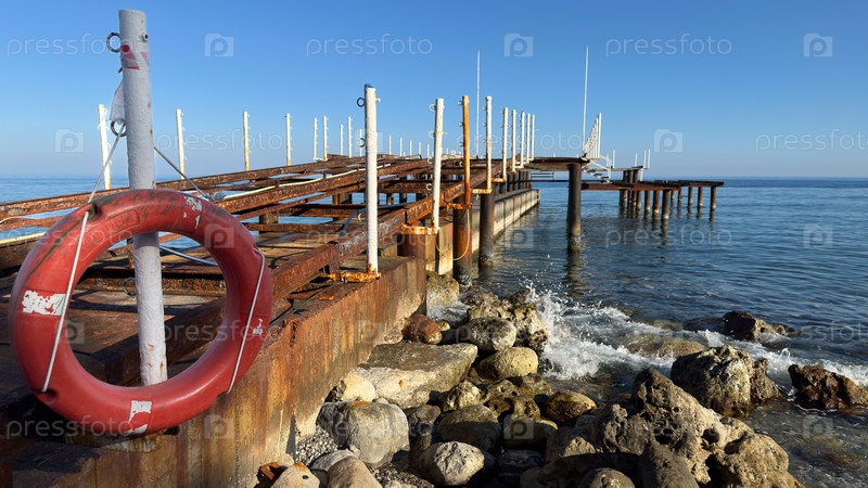 Старый пирс, волны разбивающиеся о прибрежные камни, солнечный день на Средиземном море, Турция