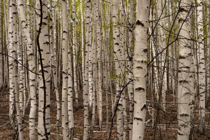 Березовая роща, белые стволы берез крупный план, ранняя весна