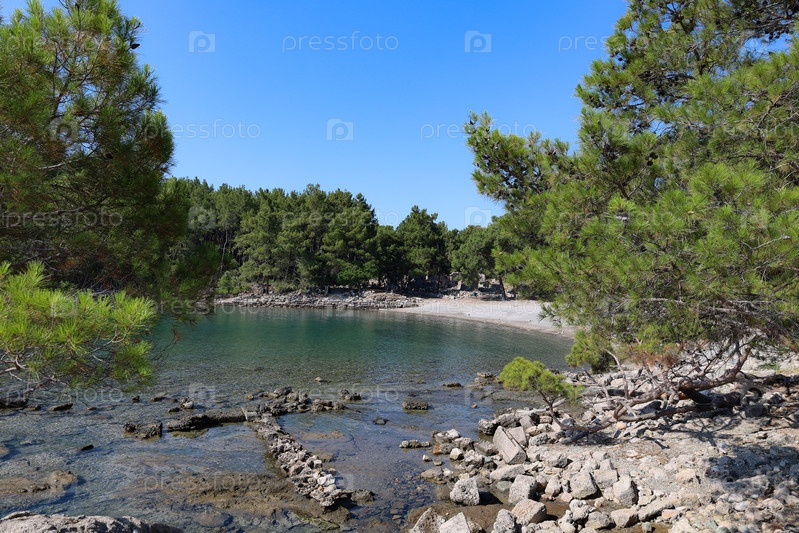Сосны на берегу Средиземного моря в районе исторической достопримечательности древнего города Фаселиса в Турции