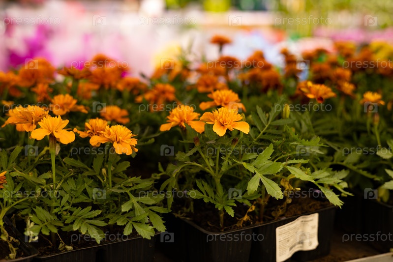 Бархатцы в горшках в цветочном магазине для продажи, рассада цветов