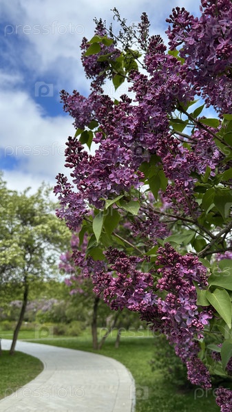 Куст цветущей сирени в городском парке в облачный пасмурный весенний день