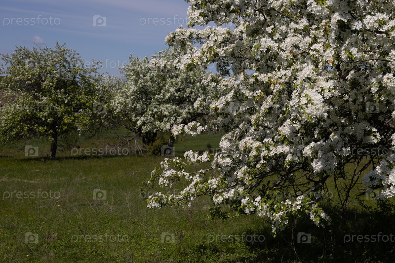 Белые цветы цветущей яблони, на фоне сада и голубого неба