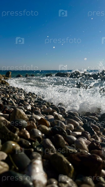 Волна разбивающаяся о прибрежные камни в солнечный день на море, Турция