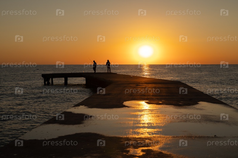 Восход солнца над Средиземным морем в Турции, темные силуэты рыбаков на пирсе