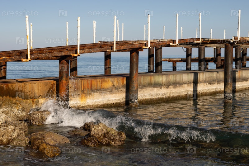 Старый пирс, волны разбивающиеся о прибрежные камни, солнечный день на Средиземном море, Турция