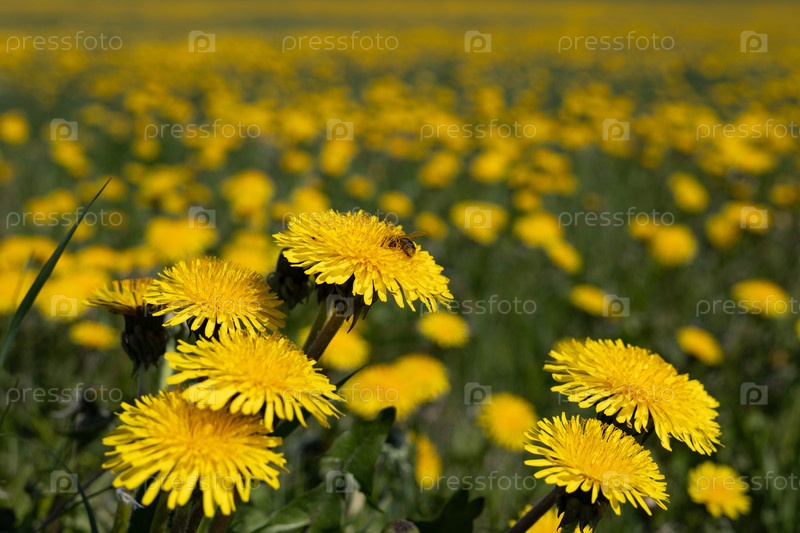 Желтые цветы одуванчика крупным планом на размытом фоне, пчела на цветке