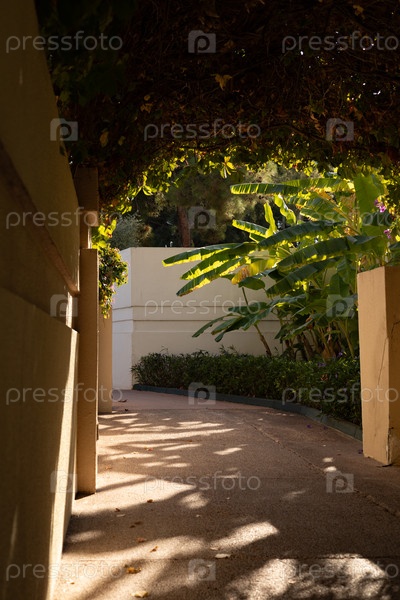 Вид на сад с банановыми деревьями сквозь арку, солнечный свет и тени, отель в Турции