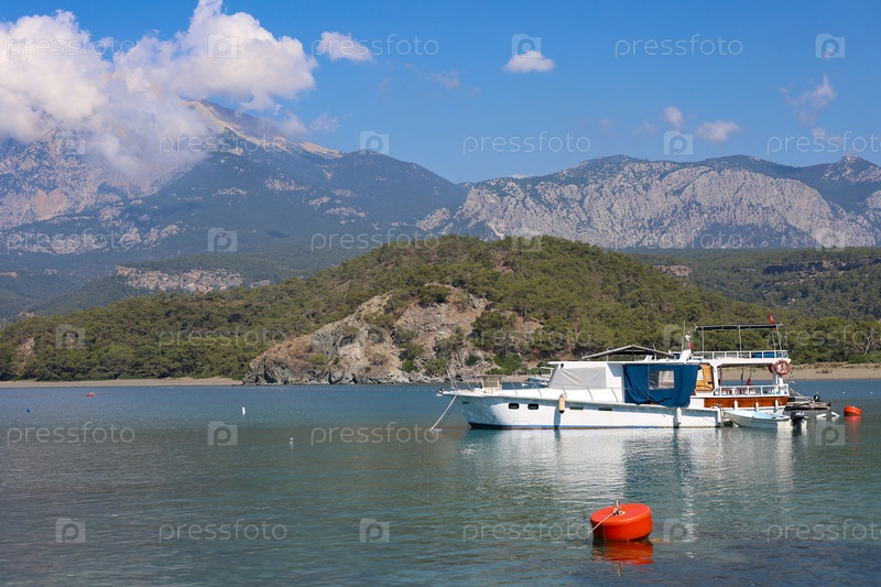Пришвартованные катера в море на фоне горного пейзажа, каменистый берег, Турция