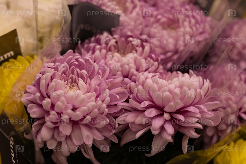 Хризантемы розовые в горшках в цветочном магазине для продажи