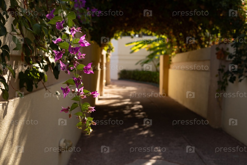 Розовые цветы Бугенвиллея, арка заросшая вьюном в отеле в Турции, солнечный день, тени
