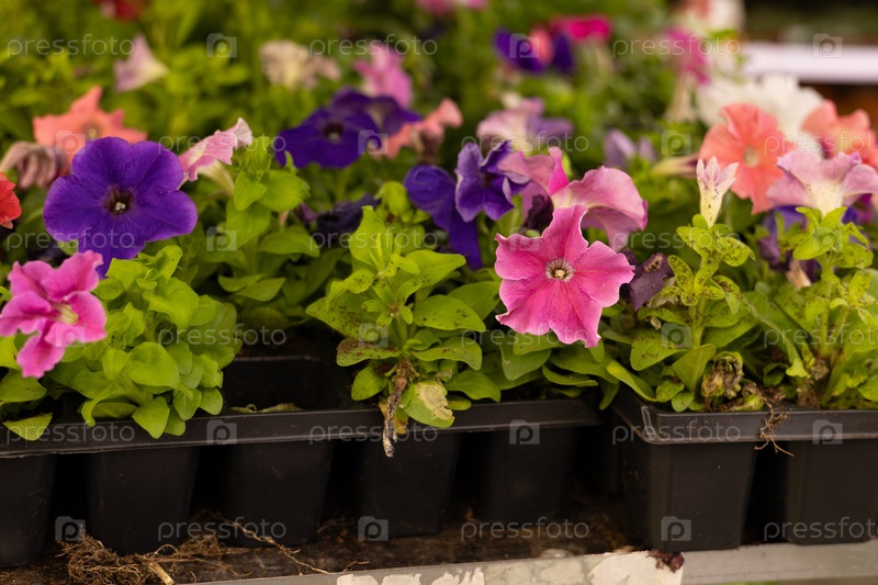 Петуньи разноцветные в горшках в цветочном магазине для продажи