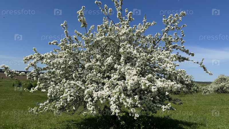 Белые цветы цветущей яблони, на фоне вспаханной пашни и голубого неба