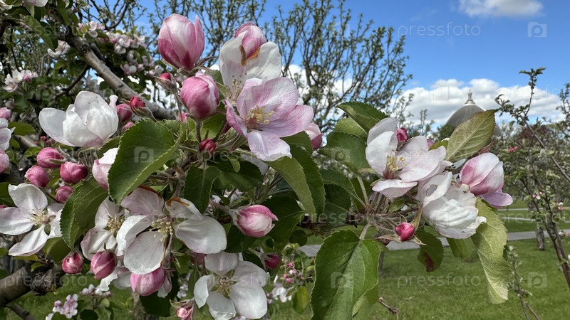 Розовые цветы цветущей яблони, на фоне голубого неба