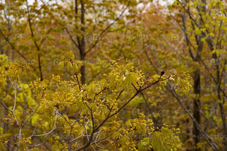 Цветение клена весной, молодая листва на фоне леса, рощи