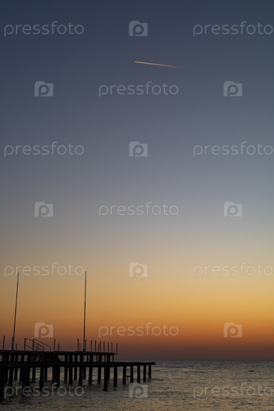Восход солнца над Средиземным морем в Турции, темный силуэт старого пирса