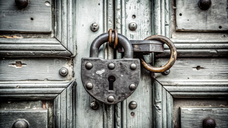 Закрытая деревянная дверь, закрепленная большим старым навесным замком, демонстрирующим выветрившийся шарм