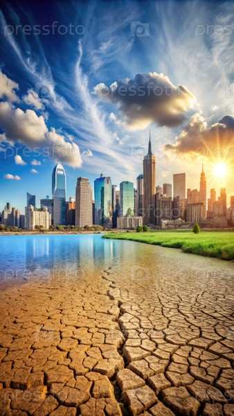 ИИ-генерированное изображение городского ландшафта, затронутого изменением климата во время захода солнца