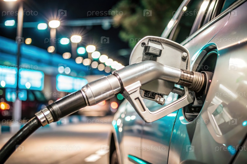 Серебряный металлический автомобиль заправляется ночью на хорошо освещенной заправочной станции
