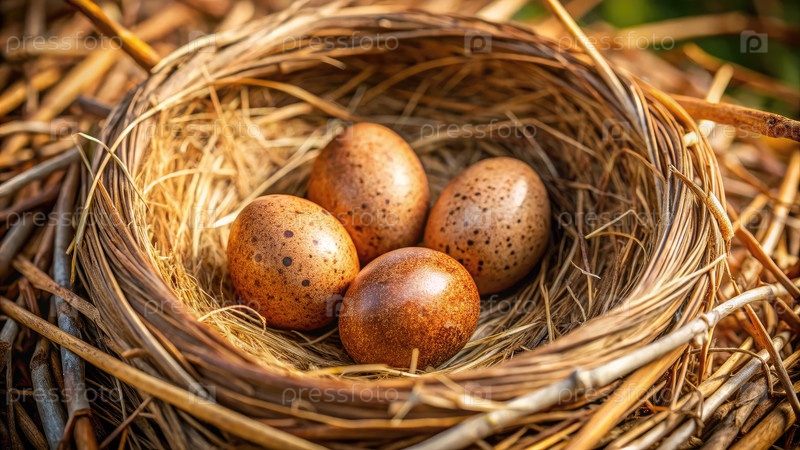 Близкий план четырех коричневых яиц птицы, расположенных в естественном гнезде с ветвями и травой